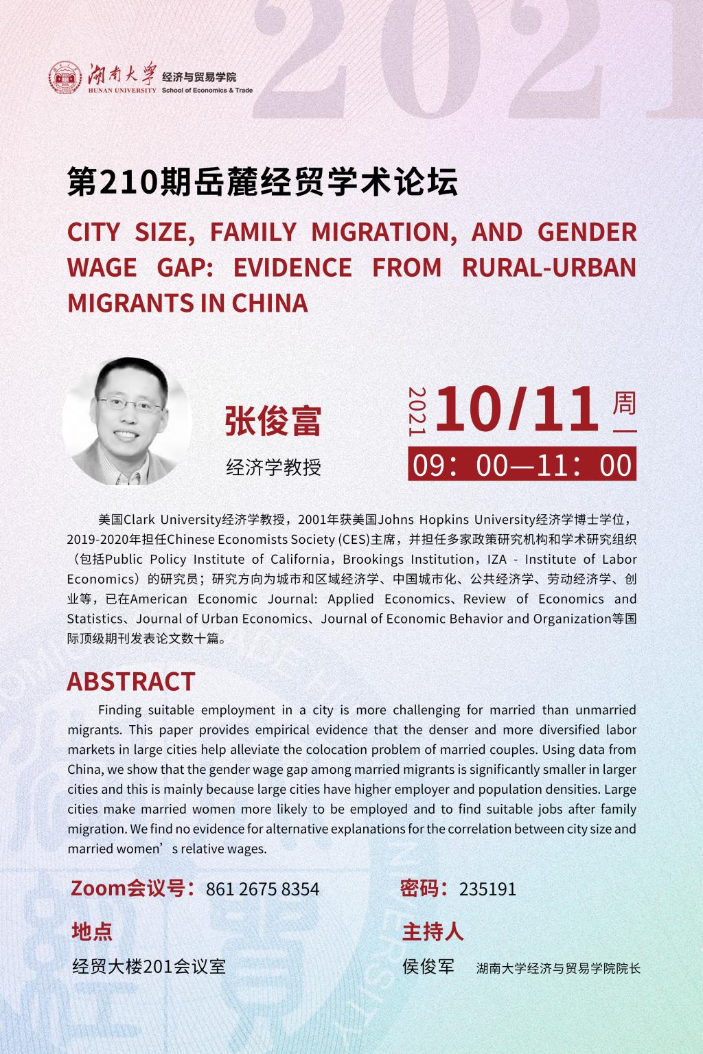 张俊富:City Size, Family Migration, and Gender Wage Gap: Evidence from Rural-Urban Migrants in China
