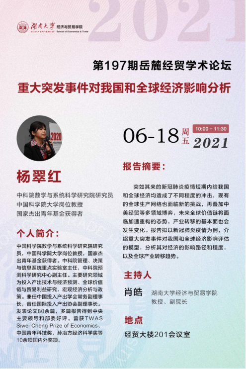 个人简介:中国科学院数学与系统科学研究院研究员,中国科学院大学岗位教授,国家杰出青年基金获得者。中科院管理、决策与信息系统重点实验室主任,中科院预测科学研究中心副主任。主要研究领域为投入产出技术与经济预测、全球价值链与贸易利益研究、宏观经济分析与政策。兼任中国投入产出学会常务副理事长,曾任国际投入产出协会副理事长。发表论文80余篇,多篇报告得到中央主要领导和部委好评。曾获TWAS Siwei Cheng Prize of Economics、中国青年科技奖、孙冶方经济科学奖等10余项国内外奖项。