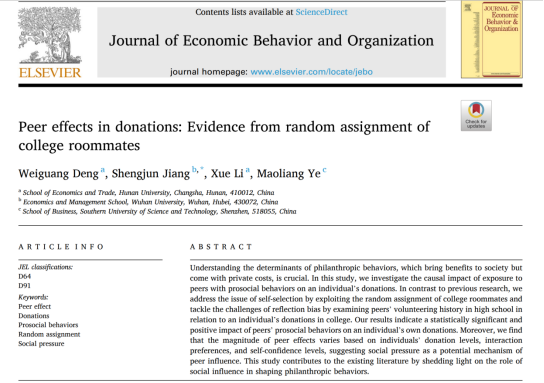 邓卫广副教授负责的论文“Peer effects in donations: Evidence from random assignment of college roommates”在国际行为和组织经济学领域顶级期刊Journal of Economic Behavior and Organization (JEBO)发表。