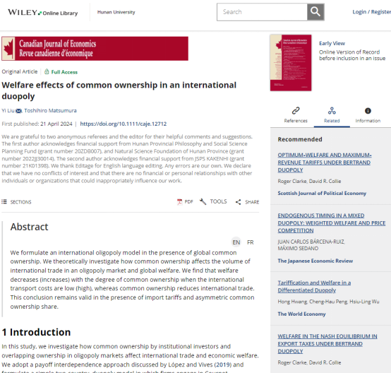 刘懿副教授与东京大学Toshihiro Matsumura教授合著论文“Welfare effects of common ownership in an international duopoly”被《Canadian Journal of Economics》(CJE)录用。CJE是由加拿大经济学会主办的综合性经济学期刊,在经济学界享有良好声誉和广泛认可度,是成人抖音