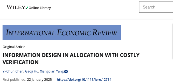 杨湘黔副教授与合作者Yi-Chun Chen教授(新加坡国立大学)、虎高计副教授(上海财经大学)合作撰写的论文“Information design in allocation with costly verification”(作者名按字母序排列)在经济学国际顶级期刊International Economic Review正式online见刊。