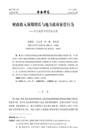 余锦亮老师与中南财经政法大学祁毓教授合作撰写的学术论文《财政收入预期增长与地方政府策略性征管行为——来自地级市的经验证据》在《金融研究》2025年第11期刊出。