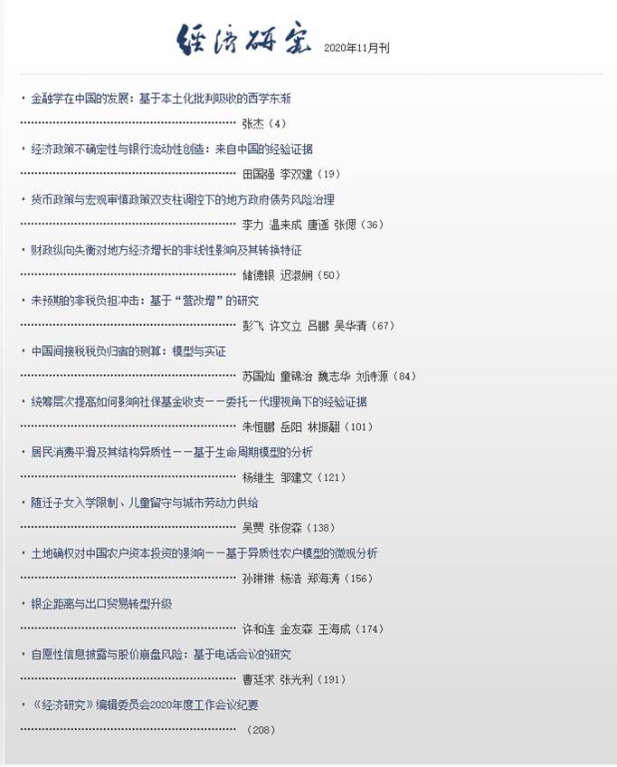 《经济研究》是国内最权威的经济学期刊。是由中国社会科学院主管、中国社会科学院经济研究所主办的全国性综合经济理论刊物,创办于1955年,1998年被国家新闻出版署评为“百种全国重点社科期刊”,2000年获首届“国家期刊奖”(唯一入选的经济理论期刊),2009年被中国期刊协会和中国出版科学研究所评为“新中国60年有影响力的期刊”(唯一入选的经济理论期刊)。2012—2017年,被连续六年评为当年度“中国最具国际影响力学术期刊(人文社会科学)”;连续三次(2013年、2015年、2017年)由国家新闻出版广电总局推荐为“百强社科期刊”。在《中国人文社会科学期刊AMI综合评价报告(2018年)》中,《经济研究》继续被评为经济学科仅有的“顶级”期刊。《中国学术期刊(光盘版)》电子杂志社和中国科学文献计量评价研究中心最新发布的《中国学术期刊影响因子年报》(人文社会科学•2019版)显示:《经济研究》的影响力指数(CI)为1414.214,学科排名居于首位;同时,《经济研究》的复合影响因子和期刊综合影响因子分别为11.524和8.436,学科排名亦均居于首位。