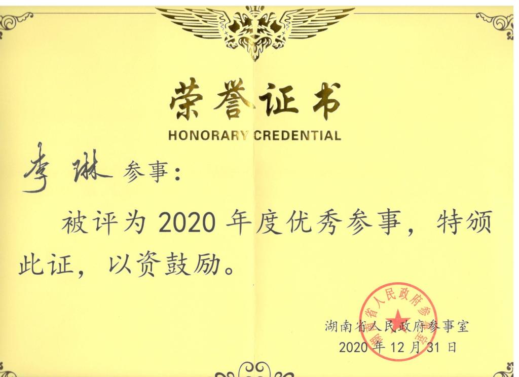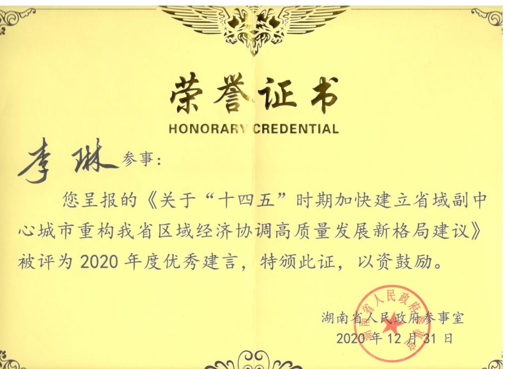 李琳教授被湖南省人民政府参事室评为2020年度优秀参事,其呈报的《关于“十四五”时期加快建立省域副中心城市 重构我省区域经济协调高质量发展新格局建议》获评2020年度优秀建言。