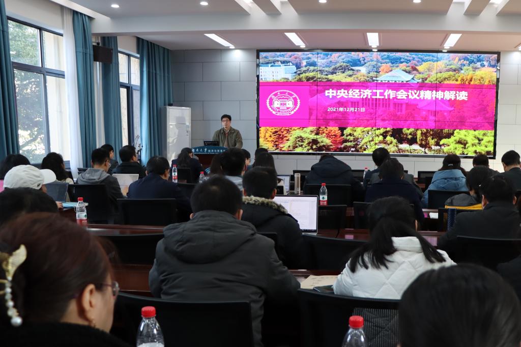 侯俊军结合十九届六中全会精神学习,作《中央经济工作会议精神解读》的宣讲报告,重点从中央经济工作会议中对2021年的经济工作总结、当前局势以及对明年经济工作的部署安排等几个方面进行解读。侯俊军强调,要运用哲学、社会、科学、研究中的三个逻辑,即历史逻辑、理论逻辑、现实逻辑,认真研读文本内容,把经济工作会议的精神结合进科学研究、人才培养和社会服务的过程中,逐步培养出对经济工作拥有高度敏感性和引领性的高水平学术人才。
