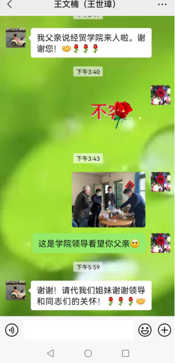 在学院防疫协调会获知这个消息后,留守学院值班的学院领导非常重视。院党委书记祝树金、副院长徐航天、院办主任肖力、辅导员志愿者黄佩,携带饭菜、水果、食品、防疫口罩等物资,不顾连日值班的辛苦,专程来到王老师家中进行慰问,了解其在疫情防控期间的困难和诉求。