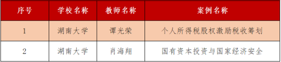 谭光荣老师《个人所得税股权激励税收筹划》案例、肖海翔老师《国有资本投资与国家经济安全》案例均获二等奖。这是近年来学院在教学方式探索实践、课程建设提质增效方面的重要成果和突出体现。