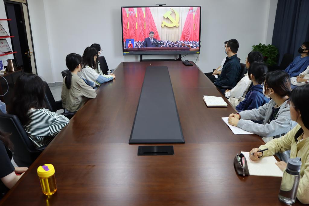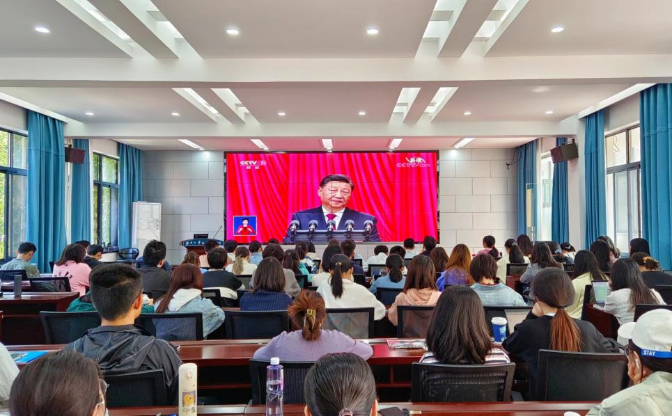 成人抖音 师生在行政楼集中收看党的二十大开幕会盛况,认真聆听、学习、热议习近平总书记的报告。