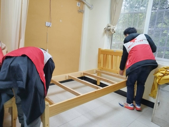 志愿者们为老人更换床架