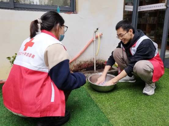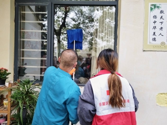 志愿者在工作人员的指导下擦拭门窗