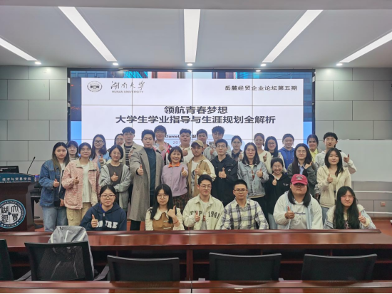 “岳麓经贸企业论坛”,开展主题为《领航青春梦想——大学生学业指导与生涯规划全解析》的讲座。学院党委副书记李曼和学院教师周梦、肖遥、张冬梅参加讲座,讲座由2017级辅导员周梦老师主持。