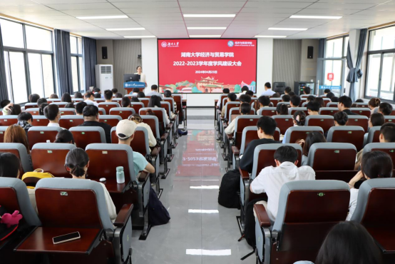 在经贸大楼501会议室召开2022-2023学年度学风建设表彰大会暨2024年度学风建设月启动仪式。学院院长祝树金、党委书记邓利华、柠乐集团创始人邓奇、全体学院领导班子、部分教师代表、辅导员、获奖学生代表、2023级学生代表参会。会议由学院党委副书记李曼主持。
