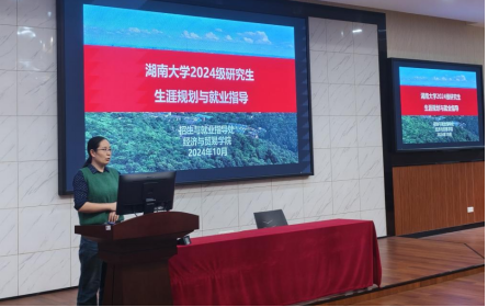 在财院校区老食堂二楼报告厅开展了生涯规划和就业指导入学教育专题讲座,学院党委副书记李曼老师主讲,研究生辅导员田丽靖老师主持,2024级全体研究生新生参加。