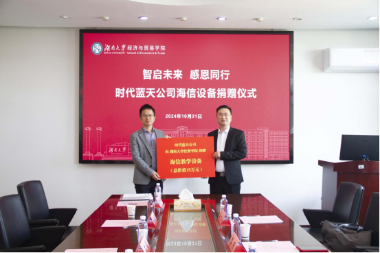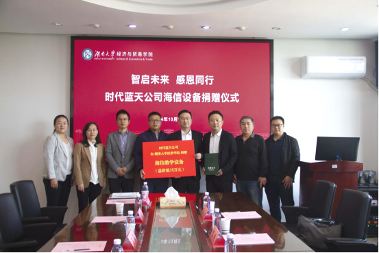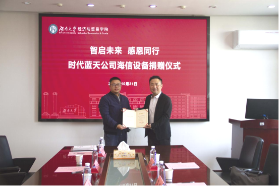 左鑫副处长代表学校向时代蓝天颁发捐赠证书,徐航天副院长代表学院接受了时代蓝天捐赠的海信教学设备。
