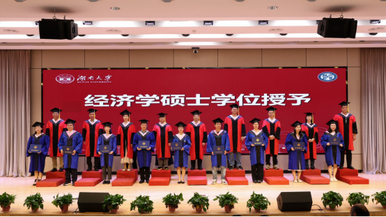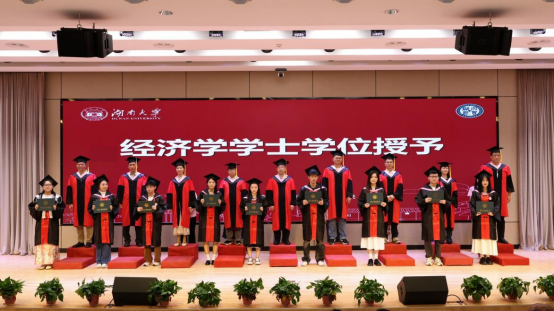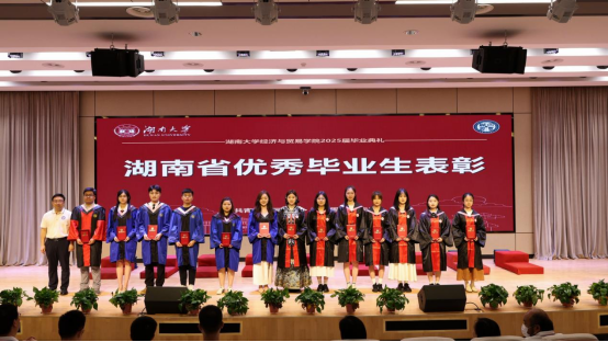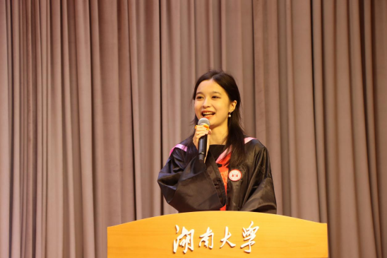 教师代表蒯文婧回顾了同学们在校期间的成长与收获,叮嘱毕业生们要保持清醒头脑洞察深层逻辑、勇于开拓创新打破既定范式,以经济学人的“清醒与热忱”,践行“实事求是,敢为人先”的使命。博士毕业生代表田彩红以学院如“书”为喻,感念学院“经世致用”情怀、科研路上的坚守与湖湘文化的韧性,表示未来将带着学院赋予的精神财富奔赴四方。本科生毕业生代表沈梦婷以“托举的力量”致谢师长父母与时代前辈的精神传承,鼓励毕业生们铭记被托举之恩,勇担使命,传递托举精神。