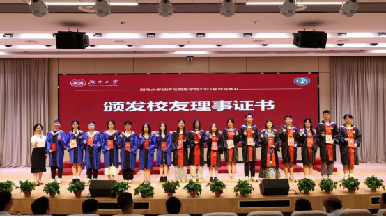院长祝树金为省优秀毕业生颁发证书,学院党委书记邓利华为2025届校友理事颁发证书。