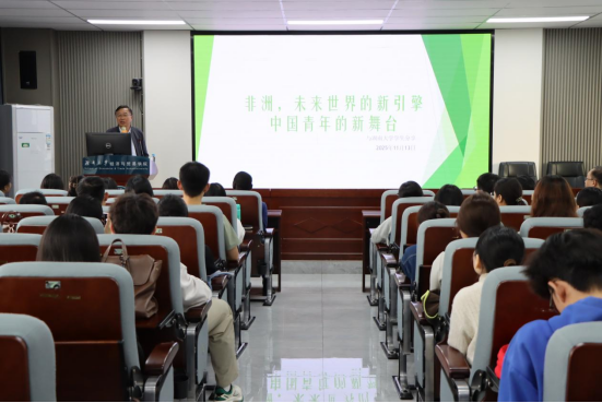 学生作了题为《非洲——未来世界的新引擎与中国青年的新舞台》的专题报告。作为拥有28年非洲工作经历的资深专家,他以丰富的一线经验与前瞻视野,从非洲资源禀赋、经济发展趋势和中非合作前景等维度展开深入剖析,生动阐释了中国青年在非洲发展浪潮中所面临的机遇与应有的担当。报告现场互动热烈,同学们积极提问,展现出对拓展国际视野的浓厚兴趣与强烈意愿。