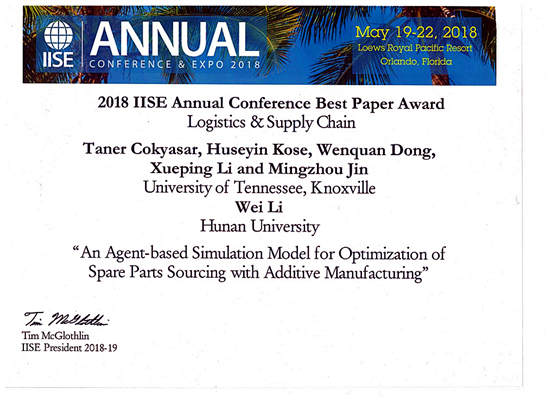 2018519-22日,国际工业与系统工程师学会2018年会(IISE 2018 Annual Conference)在美国奥兰多召开。本次会议有加州大学伯克利分校、西北大学、俄亥俄州立大学、伊利诺伊大学香槟分校和田纳西大学等51所世界知名高校,波音公司、联邦快递、UPS18家跨国公司参加。主讲嘉宾包括Citrix System公司前CEO Kirill TatarinovAmerisource Bergen项目主管Jessica Rannow,美国宇航局肯尼迪太空中心的空间站整合与服务总监Nancy P. Bray。成人抖音 李巍副教授与美国田纳西大学多名学者的合作论文《“An Agent-based Simulation Model for Optimization of Spare Parts Sourcing with Additive Manufacturing》获得IISE2018年最佳论文奖。