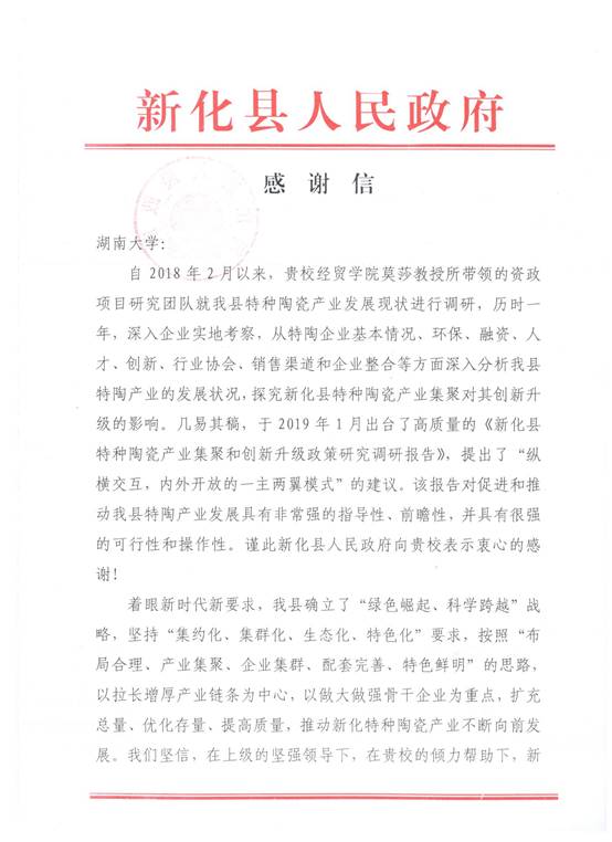 莫莎副教授带领的资政项目团队针对新化县电子陶瓷产业所做的调研报告给予了充分肯定,认为该团队提出的政策建议对推动新化县特陶产业发展具有非常强的指导性和前瞻性,并具有很强的可行性和操作性。他代表新化县人民政府送来了一份感谢信,对成人抖音