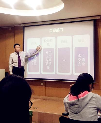 尹远老师介绍了海关征收企业进出口税的情况、海关的历史和发生变化,特别就2018年机构改革后,进出口商品检验部门并入海关,海关所具有的新职能进行了重点介绍,帮助同学们了解到海关不仅具有征收进出口税、防止走私的作用,更是担负着保护国家安全的作用。同学们如同身临其境般地感受到了海关的魅力,并且深刻了解了海关的重要性。
