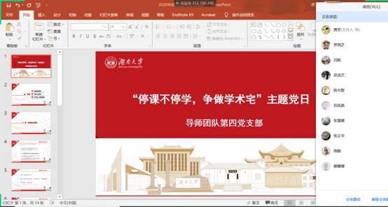 为深入落实学校疫情防控期间工作安排,进一步提升支部党员疫情防控的自觉意识和担当意识,在此次战“疫”中带头做“守护者”、“修行者”、“识途者”,3月1日,经贸院研究生导师团队第四党支部开展了主题为“停课不停学,争做学术宅”的主题党日活动,本次会议由支部书记唐芳主持,支部党员通过腾讯会议APP参加,会议由疫情防控通知、党员疫情防控期间心得体会以及“学术宅”软件推荐三个部分组成。