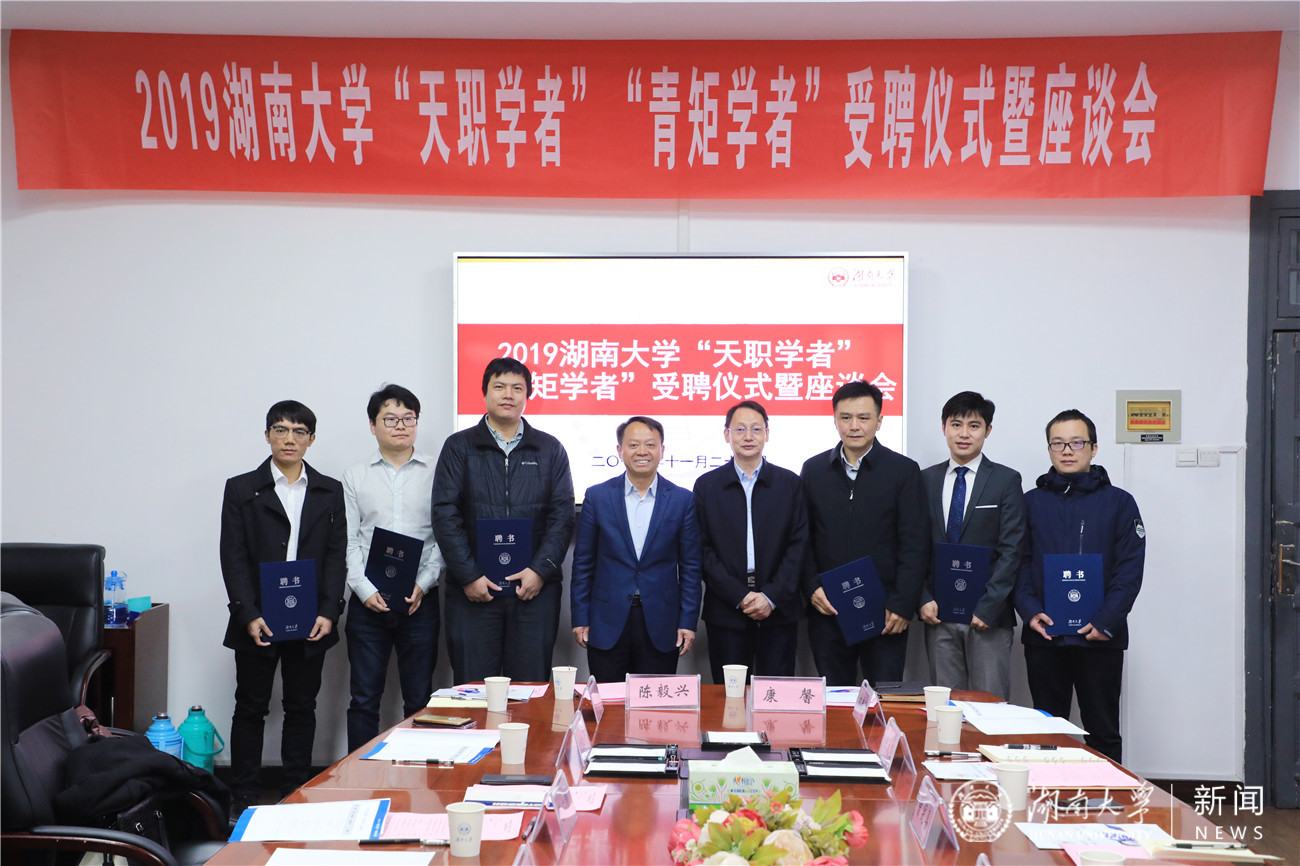 助理教授余锦亮、金融与统计学院助理教授谭发龙受聘“天职学者”,土木工程学院教授陈毅兴、张超受聘“青矩学者”。段献忠和陈永宏共同为“天职学者”“青矩学者”颁发聘书。