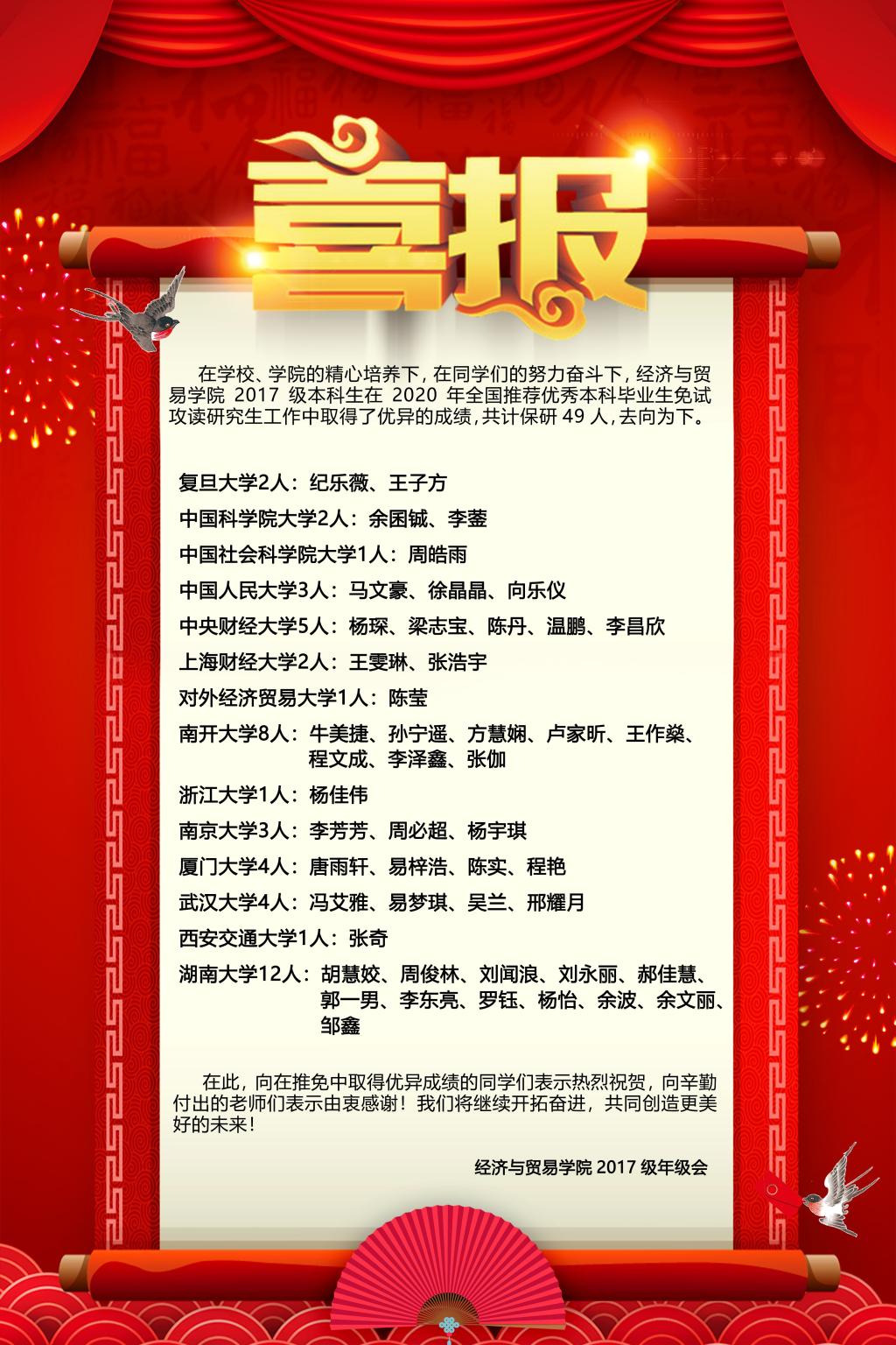 2020年保研季在上周正式落下帷幕,经贸院2017级同学在推荐免试攻读研究生工作中再创佳绩。全年级共计49位同学成功推免,去向包括复旦大学、中国人民大学、南开大学、武汉大学、浙江大学、南京大学、中国科学院大学、中国社会科学院大学、中央财经大学、上海财经大学等国内重点高校,其中保研至双一流高校人数占比77.55%(具体去向见下图)。