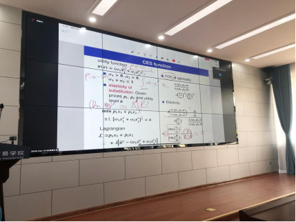 课前肖皓副院长对曾教授的个人基本情况和教学科研经历做了简要介绍。学院博士生及硕士生共54人参加了本次授课。课上曾教授首先对空间经济学发展的背景、历史以及理论脉络进行了介绍,之后在此基础上讲授了CES函数的理论基础和相关数学推导。授课过程中曾教授与同学们积极互动,针对课程中的难点进行了重点讲解,同学们反映良好,授课顺利进行。