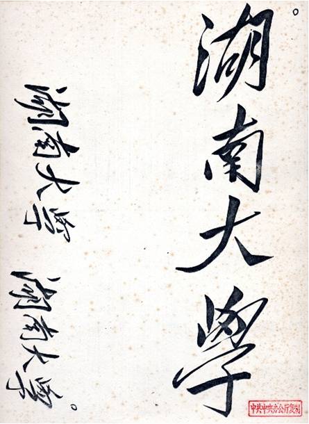 题个校名吗?”李达问。主席爽快地答应了。1950年8月20日,毛主席致函李达,题写了三个校名供湖大选择。1951年1月1日,学校在岳麓书院正门举行了隆重的校匾升悬典礼。多年来,毛主席亲笔题写的校匾伴随着湖大走过了风雨征途,见证了千年学府弦歌不绝的办学历史,至今,这一校匾仍然悬挂于校办公楼正门,熠熠生辉,成为湖大校园一处文化地标。