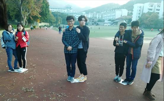 接着,在心理委员的组织下,同学们开始了“金鸡独立”游戏。同学们两人一组,站在一张报纸上,随后同学们轮流提出一个要求,没达到要求的同学就要将报纸对折,当报纸不够站立时就被淘汰,被淘汰的同学就要为全班同学表演一个节目。这个游戏使同学们之间产生了归属感,责任感,让同学们了解了互帮互助的重要性,同时加深了同学们对彼此的了解。