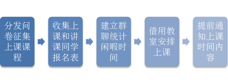 结合上学期的学习情况以及本学期的课程难度,学院决定继续开展同伴课堂以促使同学们互相学习,优化学院学风。首先为了加强上课效果,我们首先通过问卷统计同学们对各课程难度的见解并收集各班听课报名情况,根据报名的人数和收集到的问卷决定开设哪门课程,这样大大提高了上课效率。统计了信息后,我们了解到同学们普遍认为全英文课程《国际经济学》以及往年挂科率极高的《税收学》需要开课。接着我们建立群聊,收集听课同学和小老师的空闲时间以便安排上课。不过因为同学们在不同的时段都有事,因此我们再次发布群投票,遵从少数服从多数的原则,选取了听课人数最多的时段。由于本学期开课数目较少,而且课程难度较大、上课内容比较多,每节课的时间相较于上个学期都增加了二十分钟。上课时间是每周周二、周三的19:30到20:00。通过教务系统,我们长期借用了水教307教室比上学期每周借一次教室方便了好多。最后在开课前天晚上,我们具体通知了每一位同学也通过各班学委将上课内容和地点发送到各班班群,让没有报名但对部分课程内容不够了解的同学可以补缺补漏。