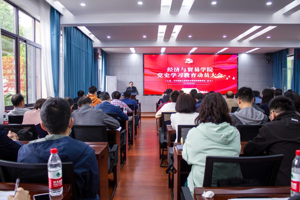在经贸大楼201会议室召开党史学习教育动员大会,会议由院长侯俊军主持,并邀请马克思主义学院副院长吴增礼教授讲授党史教育专题党课,学院全体教职员工参加会议。