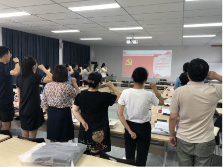 依照既定议程,本支部老师面对党旗,举起右手,由支部书记莫莎老师领读入党宣誓誓词,重温了入党宣誓场景。“不忘初心,牢记使命”是每位共产党员的行事标准和处事原则。
