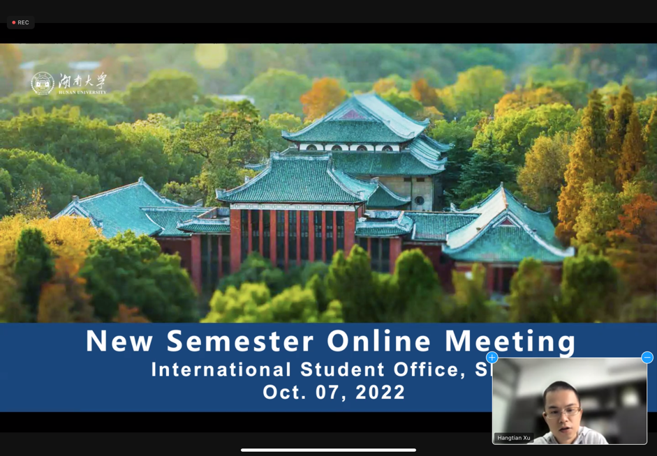 OnOctober 7th afternoon, school of Economics and Trade of Hunan University held a meeting for international students in 2022 autumn semester. Hangtian Xu (thevice dean), Zhen Cai (the international students office), AMAL AHMED MOHAMMED AL-ANESI (doctoral of the college), and international students from all over the world attended the meeting. Due to the pandemic, the meeting was held online.
